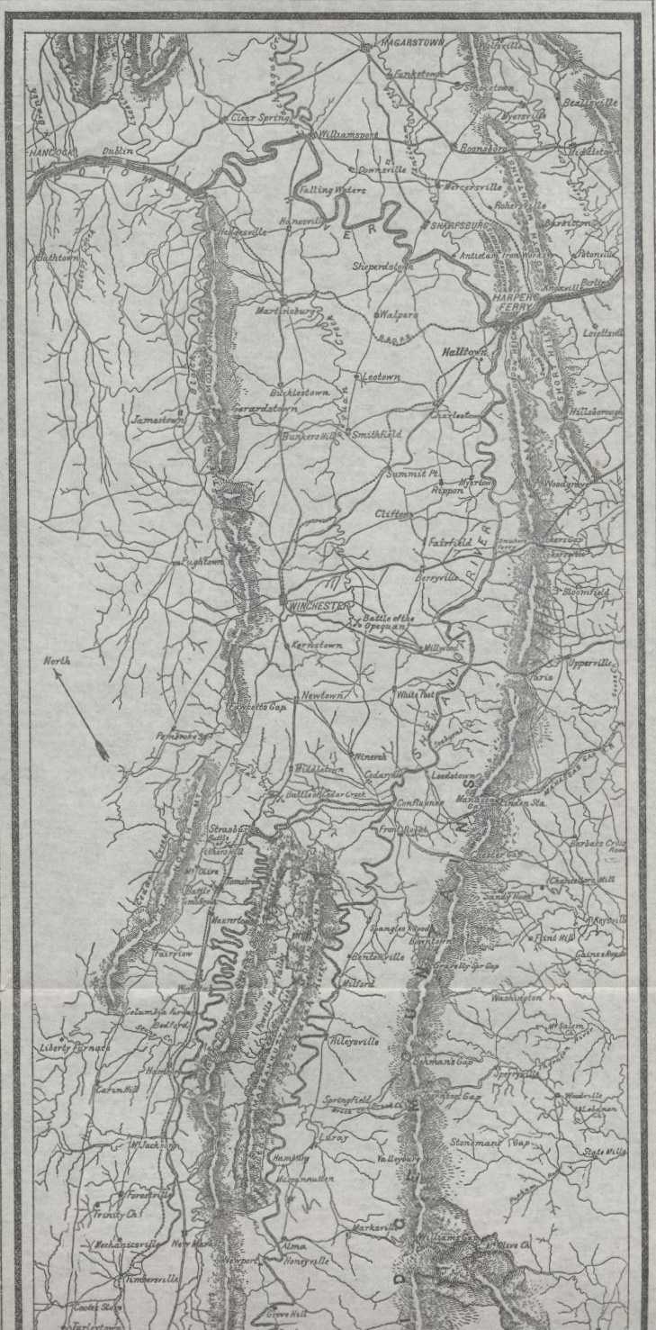 The section that received my closest attention has its northern limit along the Potomac between McCoy's ferry at the eastern base of the North Mountain, and Harper's Ferry at the western base of the Blue Ridge. The southern limit is south of Staunton, on the divide which separates the waters flowing into the Potomac from those that run to the James. The western boundary is the eastern slope of the Alleghany Mountains, the eastern, the Blue Ridge; these two distinct mountain ranges trending about southwest inclose a stretch of quite open, undulating country varying in width from the northern to the southern extremity, and dotted at frequent intervals with patches of heavy woods: At Martinsburg the valley is about sixty miles broad, and on an east and west line drawn through Winchester about forty-five, while at Strasburg it narrows down to about twenty-five. Just southeast of Strasburg, which is nearly midway between the eastern and western walls of the valley, rises an abrupt range of mountains called Massanutten, consisting of several ridges which extend southward between the North and South Forks of the Shenandoah River until, losing their identity, they merge into lower but broken ground between New Market and Harrisonburg. The Massanutten ranges, with their spurs and hills, divide the Shenandoah Valley into two valleys, the one next the Blue Ridge being called the Luray, while that next the North Mountain retains the name of Shenandoah.
