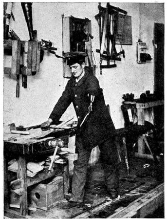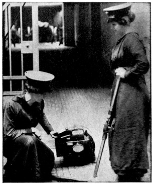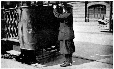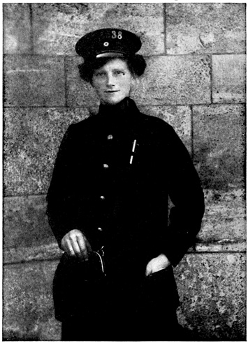 After the women ticket punchers came the women door shutters, and Frau Türschliesserin, or "Mrs. Door Shutter," is all day long on the platforms of the stations, and she must see that every train door is shut before the train starts. This is a lively job, 23 and she must jump from one door to the other. Most of these women wear bloomers, but some of them wear men's trousers tucked in their high boots. They all wear caps and badges.