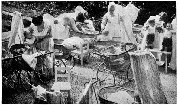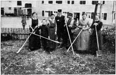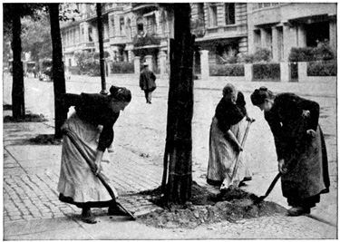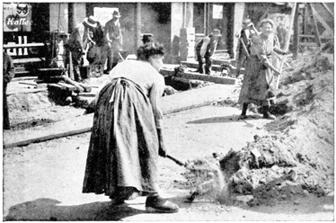 The German working woman is tremendously capable in manual labor. She never seems to get tired and she can stand all day in the wet and snow. But as a wife and mother she is becoming spoiled. She is bound to become rough, and she takes the jostlings of the men she meets with good grace, answering their flip remarks, joking with them and giving them a physical blow when she thinks it necessary. Most of the women seem to like this familiarity which working on the streets brings them, and they find it much more exciting than doing housework at home. 21
