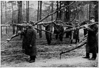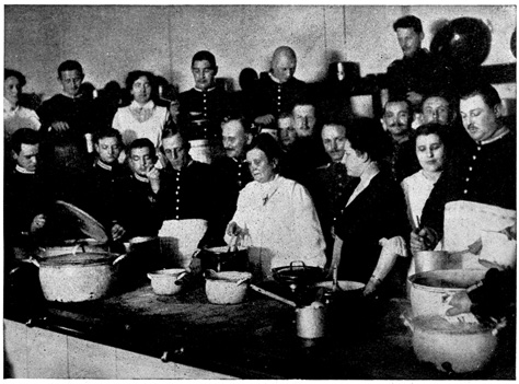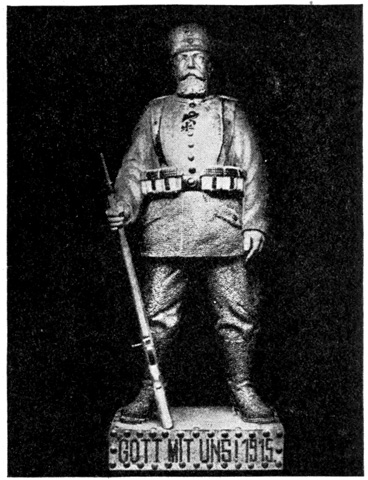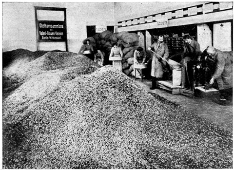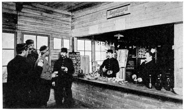 At the Friedrichstrasse Station one can see every kind of soldiers at once. There the men arrive from the front sometimes covered with dust and mud, and once I saw a man with his trousers all spattered with blood. The common soldiers carry everything with them. On their backs they have their knapsacks, and around their waists they have cans, spoons, bundles and all sorts of things. These men carry sixty-five pounds with them all the time. In one of their bags they carry what is known as their eiserne Portion or their "iron portion." This consists of two cans of meat, two cans of vegetables, three packages of hard tack, ground coffee for several meals and a flask of whisky. The soldiers are not allowed to eat this portion unless they are in a place where no food can be brought to them, and then they are only allowed to eat it at the command of a superior officer. In the field the iron portions are inspected each day, and any soldier that has touched his portion is severely punished.