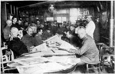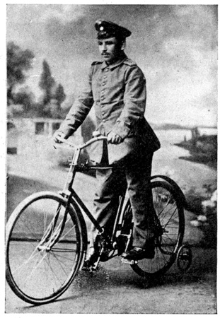 A great many of the soldiers have the Iron Cross 12 of the second class, but very rarely a cross of the first class is seen. The second class cross is not worn but is designated by a black and white ribbon drawn through the buttonhole. The first class cross is worn pinned rather low on the coat. The order Pour le mérite is the highest honor in the German army, and not a hundred of them have been given out since the beginning of the war. It is a blue, white and gold cross and is hung from the wearer's collar. A large sum of money goes with this decoration. The second class Iron Cross makes the owner exempt from certain taxes; and five marks each month goes with the first class Iron Cross.