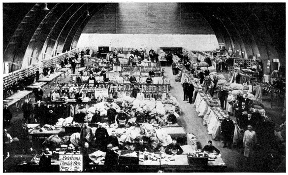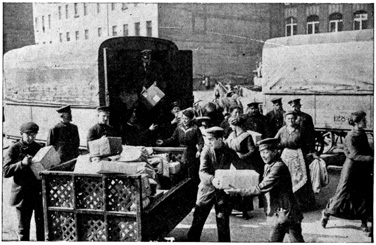 Most of the soldiers were sights. Their clothes were dirty, torn and wrinkled. Many of them coming from Russia were literally covered with a white dust. At first I thought that they were bakers, but when I saw several hundred of them I changed my mind. Beside his regular paraphernalia, each soldier had a dozen or more packages. The packages were strapped on everywhere, and one little fellow had a bundle stuck on the point of his helmet.