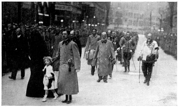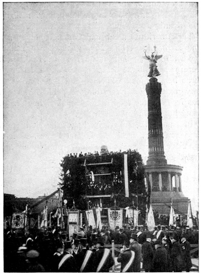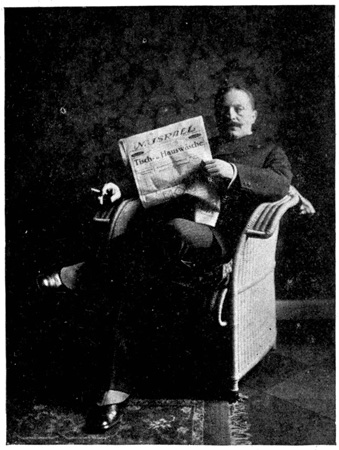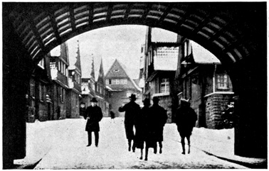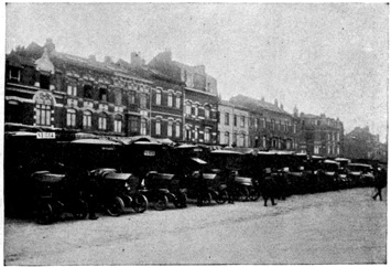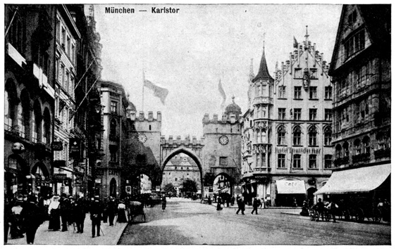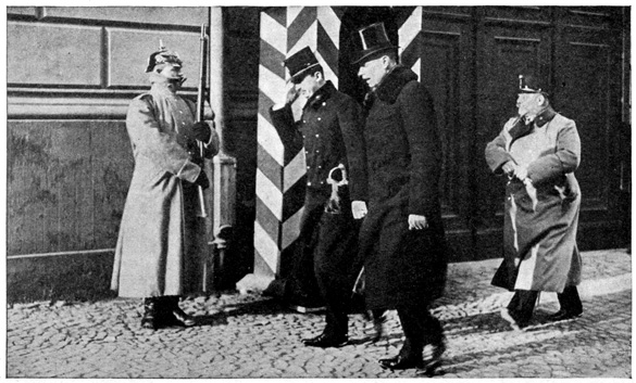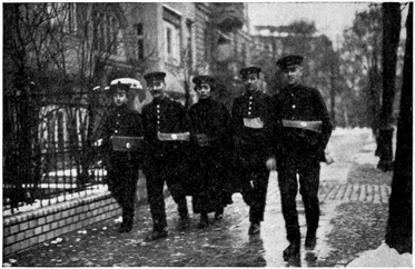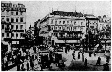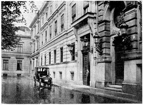 The train was due in Berlin at 9 o'clock at night, but we were late when we pulled in at the Stettin Station. We had a hard time getting a cab and finally we had to share an automobile with a strange man who was going to the same hotel. At 10 o'clock we were in our hotel on Unter den Linden. From the window I could look out on the linden trees. The lights were twinkling merrily in the cafés across the way. Policemen were holding up the traffic on the narrow Friedrichstrasse. People were everywhere. It did not seem like a country that was taking part in the great war. 7