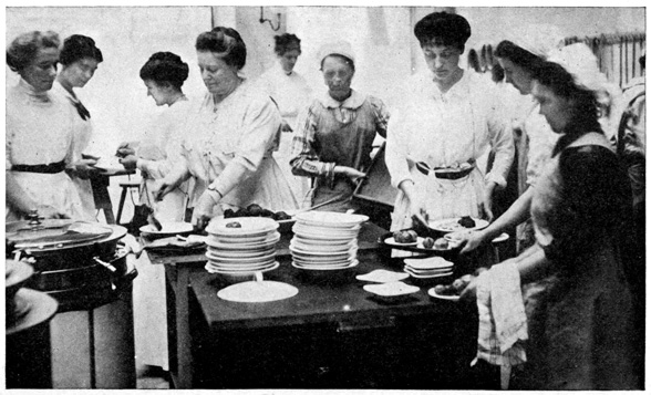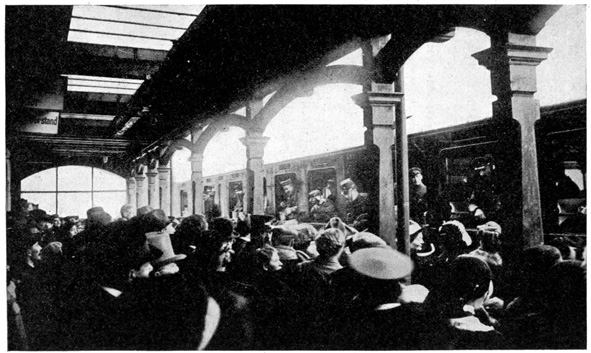 This night the soldiers came in crowds. Everybody was smiling, and in between the trains we went into the station restaurant. At every table sat a soldier and his friends. One young officer had been met by his parents, and he was so taken up with his mother that he could not sit down but he hung over her chair. Was she happy? Well, I should say so!