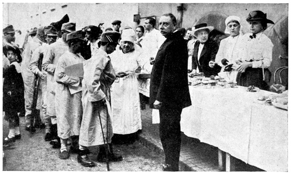 The most wonderful thing about this transit army is that everything the soldiers have, from their caps to their shoes, is new, except the soldiers just coming from the front. And yet as a rule they are not new recruits starting out, but men who have been home on a furlough or men who have been wounded and are now ready to start back to the front. To believe that Germany has exhausted her supply of men is a mistake. Personally, I know lots of young Germans that have never been drafted. The most of these men are such who, for some reason or other, have had no army service, and the German military believe that one trained man is worth six untrained men, and it is the trained soldier that is always kept in the field. If he has been wounded he is quickly hurried back to the front. By their scientific methods a bullet wound can be entirely cured in six weeks.