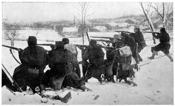 "I have come to take care of you," she said. For three weeks they were together. Helene did the same work as a man, and most of Ivan's work too. On a bitter cold day last December there was a night attack by the Germans. The Russians were ordered to charge. Ivan stumbled along blindly, and Helene supported him when she thought that he was going to fall. When they had gone a little way, there was a great roar from the German side, followed by a volley of bullets, shells burst in the air.