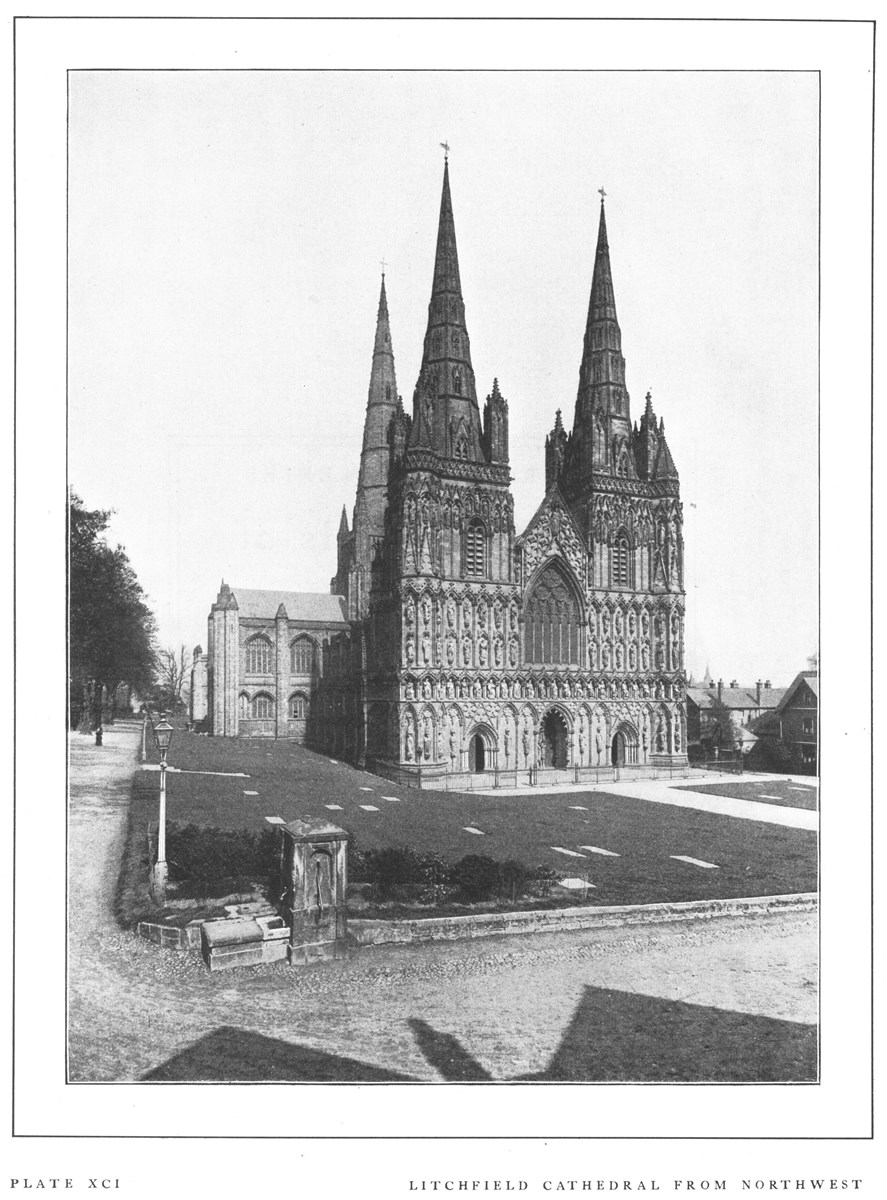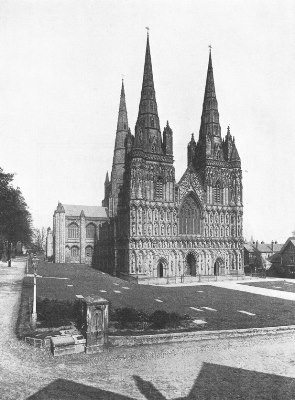 Litchfield Cathedral is sometimes styled the "Queen of English minsters," and, though surpassed by other cathedrals in age, size, grandeur of site and elaborate decoration, it has yet claim to the title because of the symmetry, proportion and picturesqueness of its general effect. It is built of red sandstone, and dates mainly from the thirteenth to the fourteenth centuries. The earliest structure on the present site was a Norman church dating from about 1100. The oldest part of the existing building is the lower part of the west half of the choir, erected about 1200. The transepts followed in 1220-40; the nave dates from 1250, and the west front from about 1280, while the Lady-Chapel belongs to the beginning of the fourteenth century. The cathedral close was formerly surrounded by a wall and moat; and in 1643 the cathedral was defended against the Puritans, who battered down the central tower and demolished many of the carvings, monuments and windows. It was, however, restored before the end of the century. The most conspicuous external features are the three beautiful spires and the fine west façade. This façade is one of the most graceful and harmonious in England; and it has the advantage over such a front as that of Peterborough in its organic connection with the rest of the building. It is covered with niches for about one hundred statues, almost all of which are now filled with modern carvings.