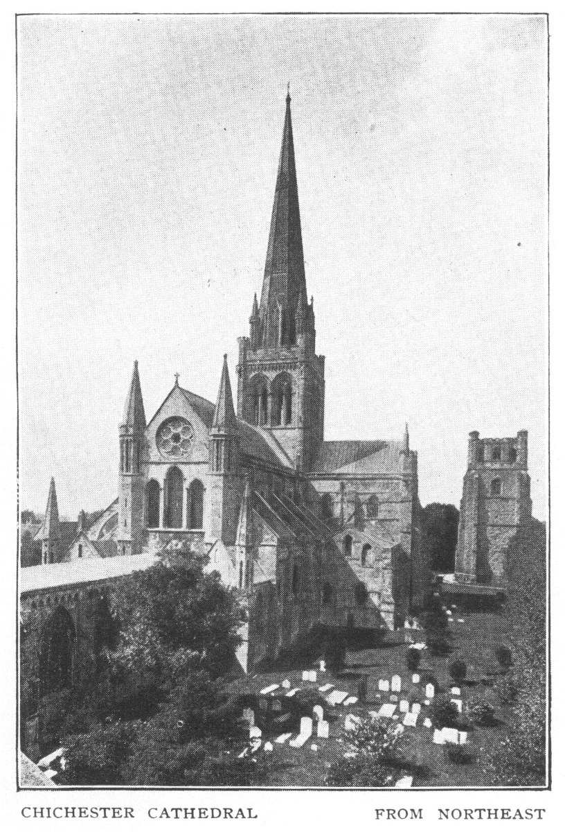 Chichester Cathedral was originally begun about 1085, completed in 1108 and burned down in 1114. In its present form it is substantially a Transitional Norman building of the twelfth century, with some pointed details introduced after a second fire in 1186. The Lady-Chapel dates from 1288-1304. The spire, erected in the fifteenth century, collapsed in 1861, and has since been rebuilt. The whole edifice has been restored since 1848. The detached Bell Tower, a feature peculiar to Chichester among English cathedrals, is, despite its weather-worn appearance, one of the most recent parts of the building, dating from the fifteenth century.
