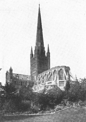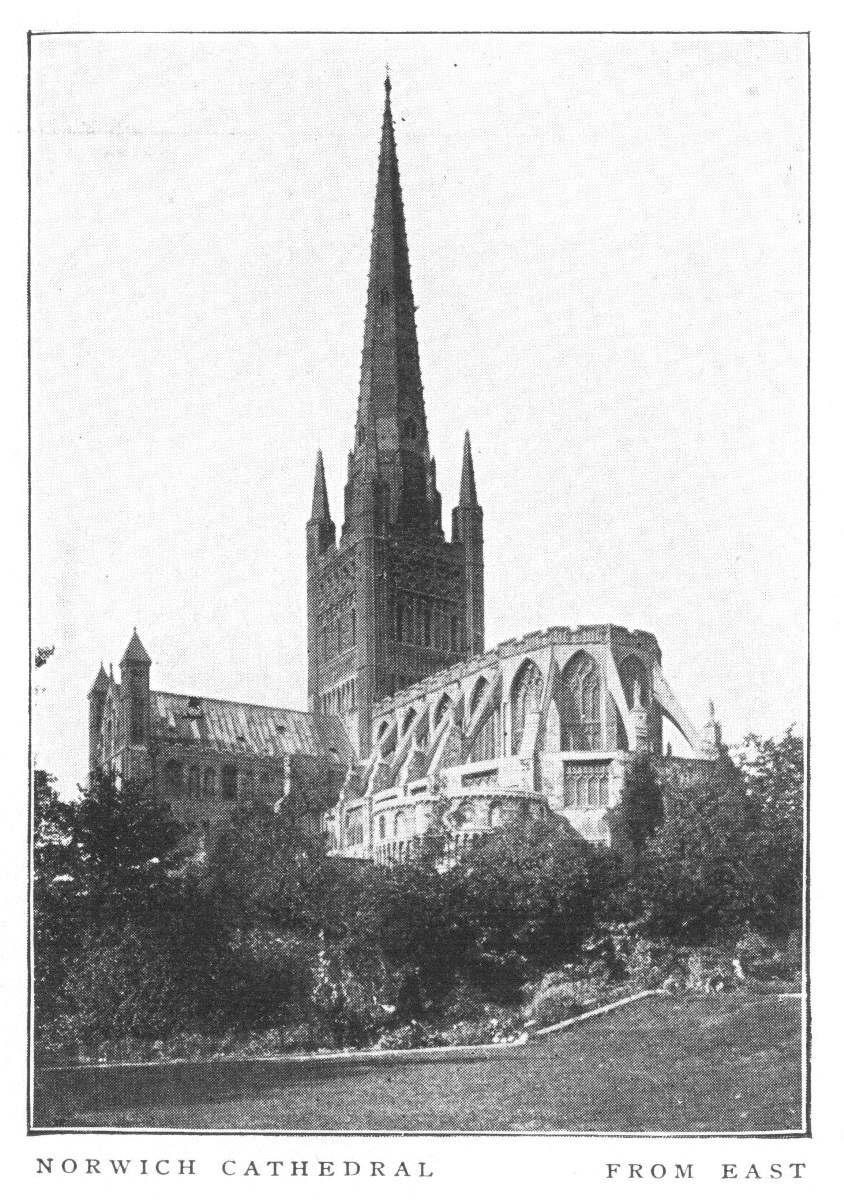 Norwich Cathedral was begun in 1096, and has preserved its original Norman plan more closely than any other in England. The first Bishop of Norwich, Herbert de Losinga, completed the choir and transepts, and began the nave. The latter was finished by his successor about 1140. The clearstory of the choir was rebuilt in 1356-69, and the vaulting of the nave and choir were added in the fifteenth century. In the same century the west front was altered, and the spire rebuilt. The most prominent features of the exterior are the lofty spire and the unusual apsidal termination of the choir.