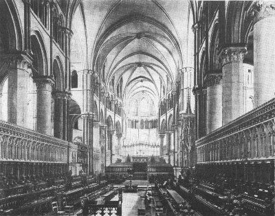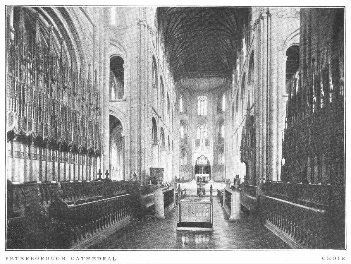 Peterborough Cathedral is one of the most important Norman churches left in England, though at first glance the exterior does not seem to bear out this assertion. The elaborate and somewhat foreign-looking west façade, with its recessed arches, gables and sculptures, is however an Early English addition of about 1220; and forms, as it were, a screen in front of the original west wall. The present building is the third church on this site. The first was destroyed by the Danes; the second was burned in 1116. The oldest part now standing is the choir, consecrated about 1140. The great transept dates from 1155-77, the late-Norman nave from 1177-93, and the west transepts, in the Transitional style, from 1193-1200. A series of uniform Decorated windows was added throughout the church in the fourteenth century. The spires and pinnacles of the flanking turrets of the west façade are of the Decorated and Perpendicular periods. The interior gives an impression of unusual lightness for Norman architecture, an effect enhanced by the color of the stone. In 1643 it suffered severely at the hands of the iconoclastic Puritans. The clearstory and triforium of the nave are impressive in size and effect. The painted wooden ceiling dates from the twelfth century.