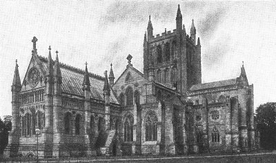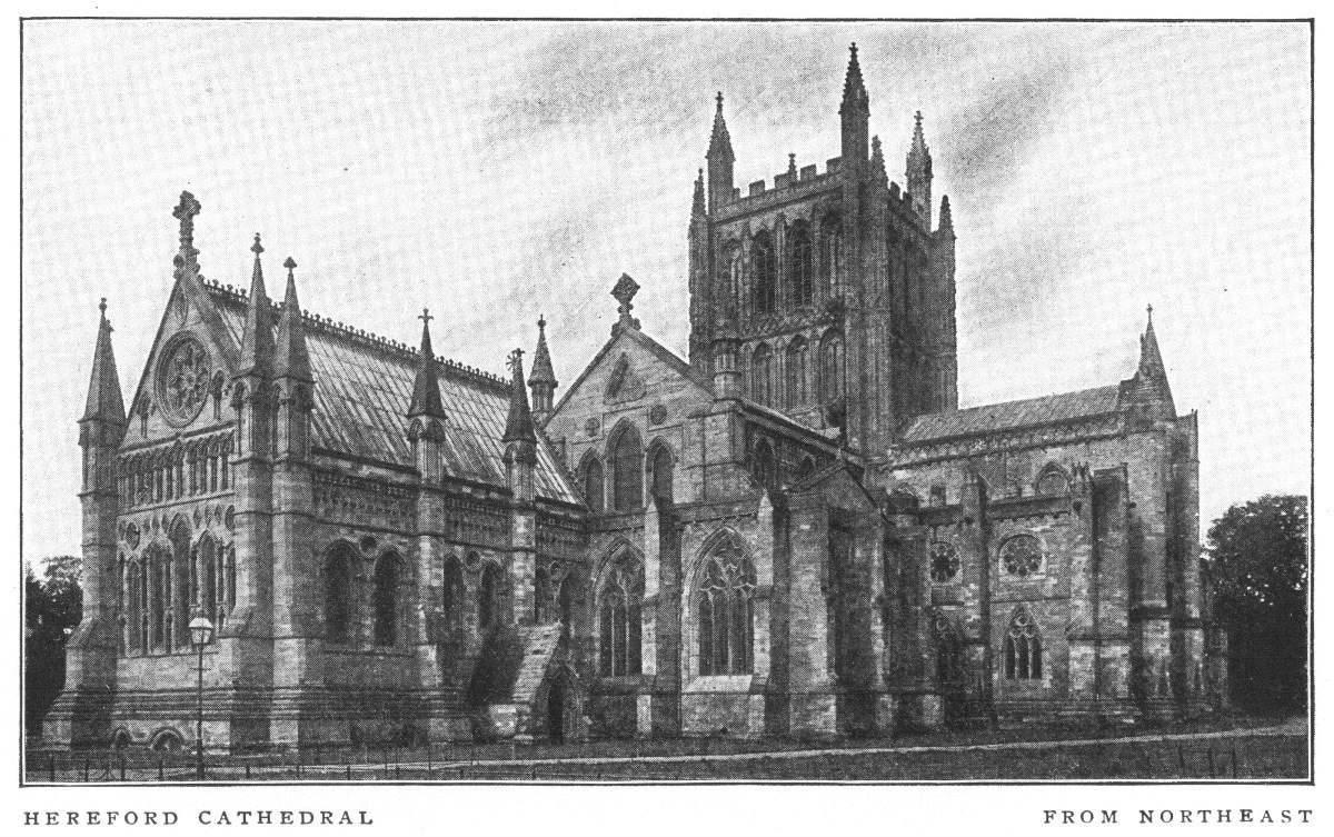 Hereford Cathedral was begun in 1079, and not finished till 1530, and consequently shows an interesting mixture of architectural styles. The nave, south transept and piers of the tower are Norman, the Lady-Chapel is Early English; the north transept was rebuilt between 1250 and 1288; the north porch was erected about 1290. The tower dates from the fourteenth century.