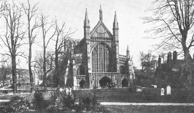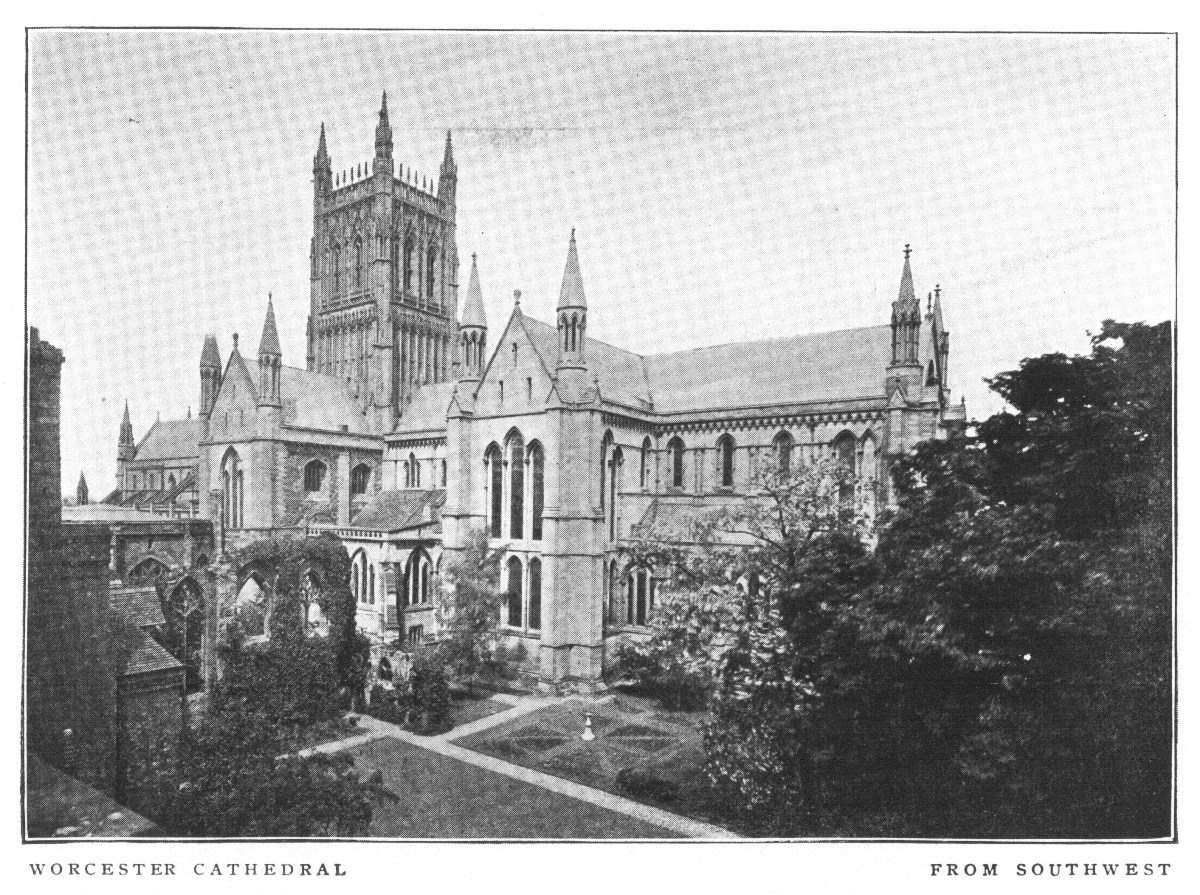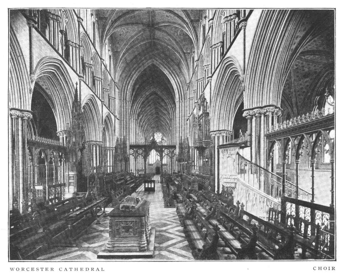Worcester Cathedral is in plan a double cross with very short transepts, and with a chapter-house and spacious cloisters on the south side. In general characteristics it is Early English, but includes specimens of all styles from the Norman down to the latest Perpendicular. The oldest parts of the present church are the choir and Lady-Chapel, which date from the first quarter of the thirteenth century. The north side of the nave belongs to the Decorated and the south side to the early Perpendicular period; but they are very similar in general appearance. The central tower shows traces of the transition from Decorated to Perpendicular. In the interior, the choir dates from the purest Early English period, and impresses by its richness and uniformity; and the magnificent groined roof, extending in an unbroken line for 420 feet, is a feature that perhaps no other cathedral can match.