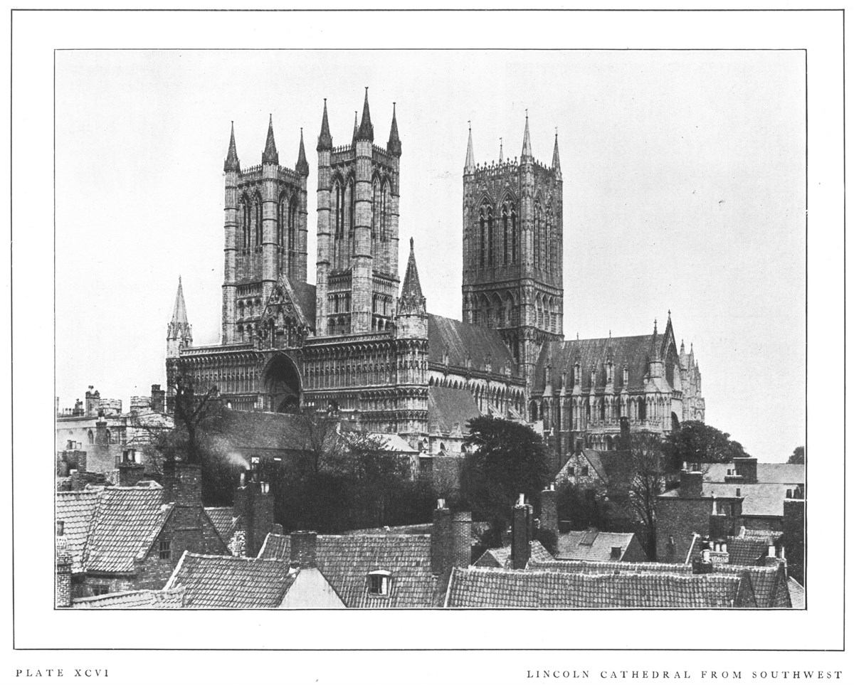Lincoln Cathedral, splendidly crowning the hill on which the city is built, may perhaps claim to be the finest church in Great Britain. Other cathedrals equal or surpass it in certain points; but in the combination of size, delicacy of detail, effectiveness of both interior and exterior, good preservation and grandeur of position, it has probably no rival. Of the original cathedral, built at the end of the eleventh century, the tower, a portion of the west front, and part of first bay of the nave remain. The Norman cathedral was injured by an earthquake in 1185, and its restoration was at once undertaken by Bishop Hugh, called "St. Hugh of Lincoln" (1186-1200), who finished the choir and east transepts—the earliest piece of Early English work of known date. The west transepts and chapter-house were completed soon after, and the nave, including the west front, by about 1250. The upper story of the central tower, which dates from about 1240-50, was added between 1300 and 1320. The upper parts of the west towers are late Decorated, dating from about 1380. Among the more noteworthy external features are the fine central and west towers, and the west façade, in spite of its mixture of styles and the fact that it is in some degree merely a screen. The choir of the interior is the oldest known example of the Early English style, and is separated from the nave by a decorated screen (1320) surmounted by the organ. Though the vaulting is too low the entire interior is harmonious and imposing.