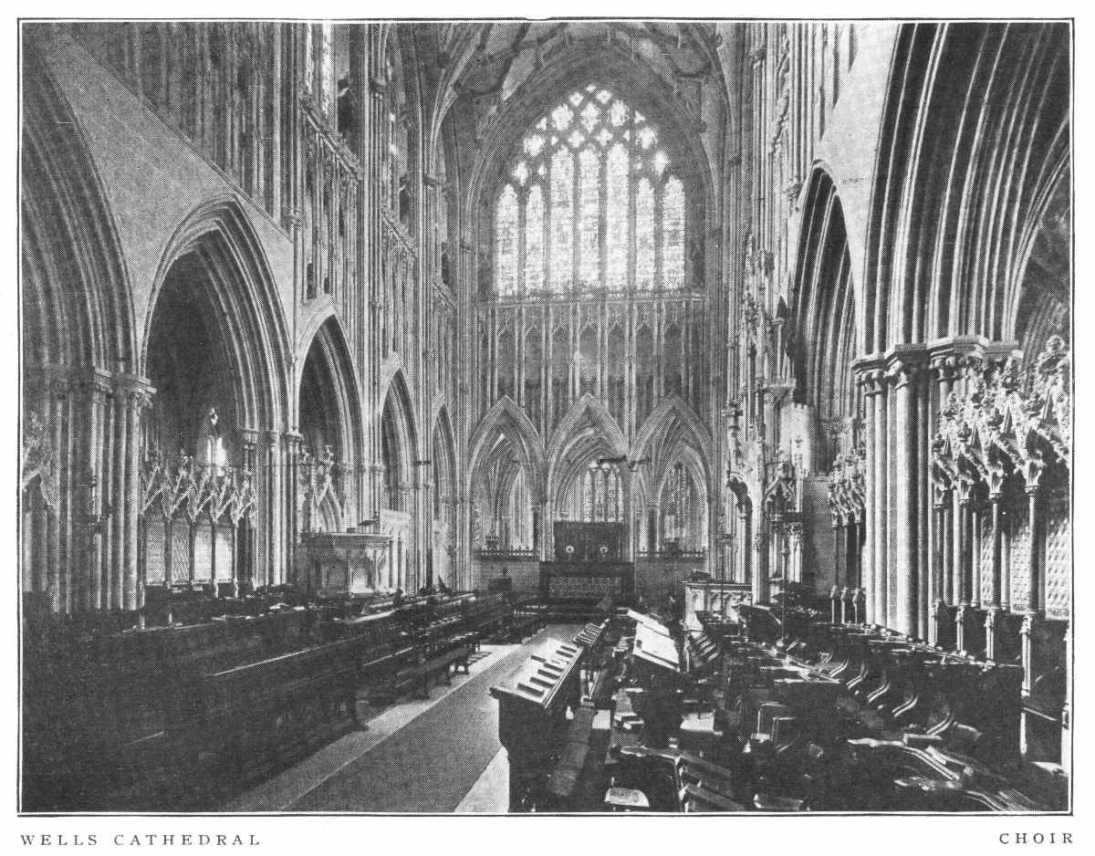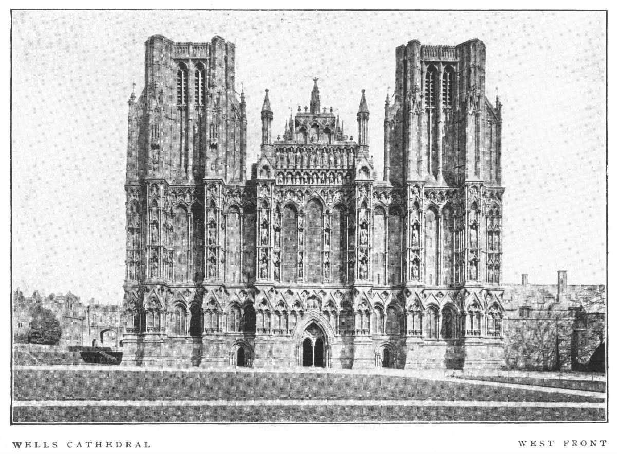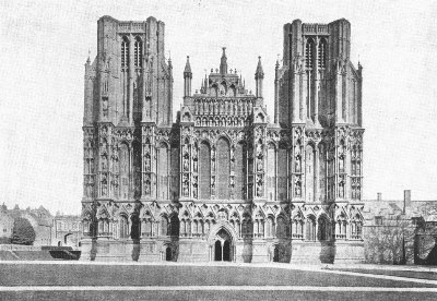 Wells Cathedral is, in its present condition, predominantly an Early English building, of the first half of the thirteenth century. It is the third church on the same site, and the foundation of the present edifice is commonly attributed to Bishop Joceline, 1206-1242. The church as he designed it was finished at the end of the thirteenth century. Thereafter a complete transformation of the east part was undertaken, the first step being the construction of the Lady-Chapel, about 1320, while the Presbytery dates from about 1350. The upper parts of the central tower also belong to the early fourteenth century. The upper parts of the west towers and cloisters are Perpendicular. The beautiful west façade, elaborately adorned with arcading and sculptures, is, like the west front of Lincoln, architecturally a mere mask. The choir, one of the most beautiful in England, is Early or Geometrical Decorated in the general effect.