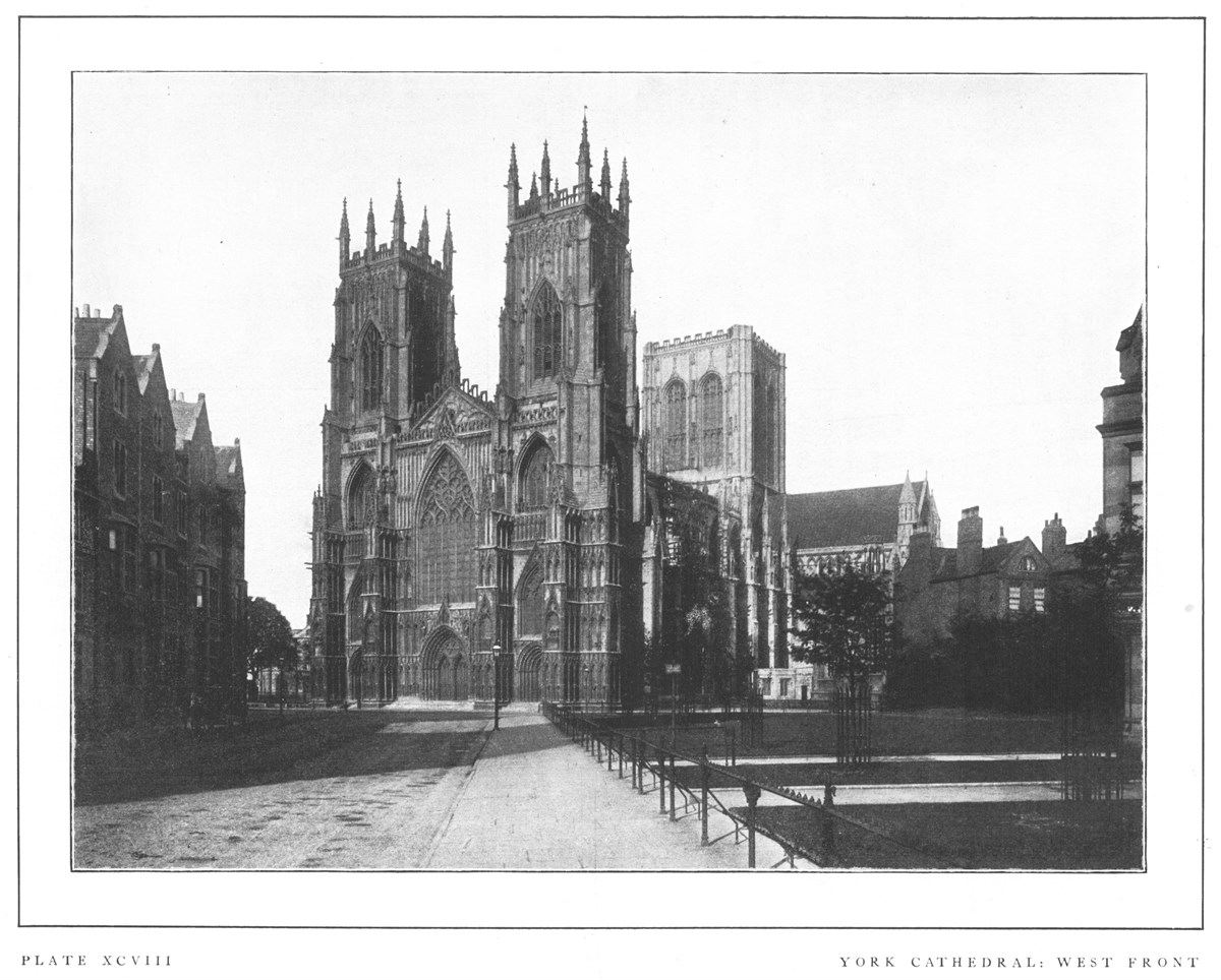 York Cathedral is one of the largest and grandest of English minsters. The present structure is the third on the site, and was built by the first Norman bishop. The choir was rebuilt by Archbishop Roger, 1154-81, the south transept by Archbishop Gray in 1215-55, and the north transept about the same time, while the Norman nave was gradually replaced by the present one between 1290 and 1345. The Lady-Chapel was added in 1360-73, and the present choir substituted for Archbishop Roger's before 1400. The towers date from the fifteenth century, and the edifice as thus rebuilt was reconsecrated in 1472. In its present form, therefore, the minster shows examples of the Early English Decorated, and early and late Perpendicular styles. The most striking features of the exterior are the noble west façade in the Decorated and the imposing central tower in the Perpendicular style.