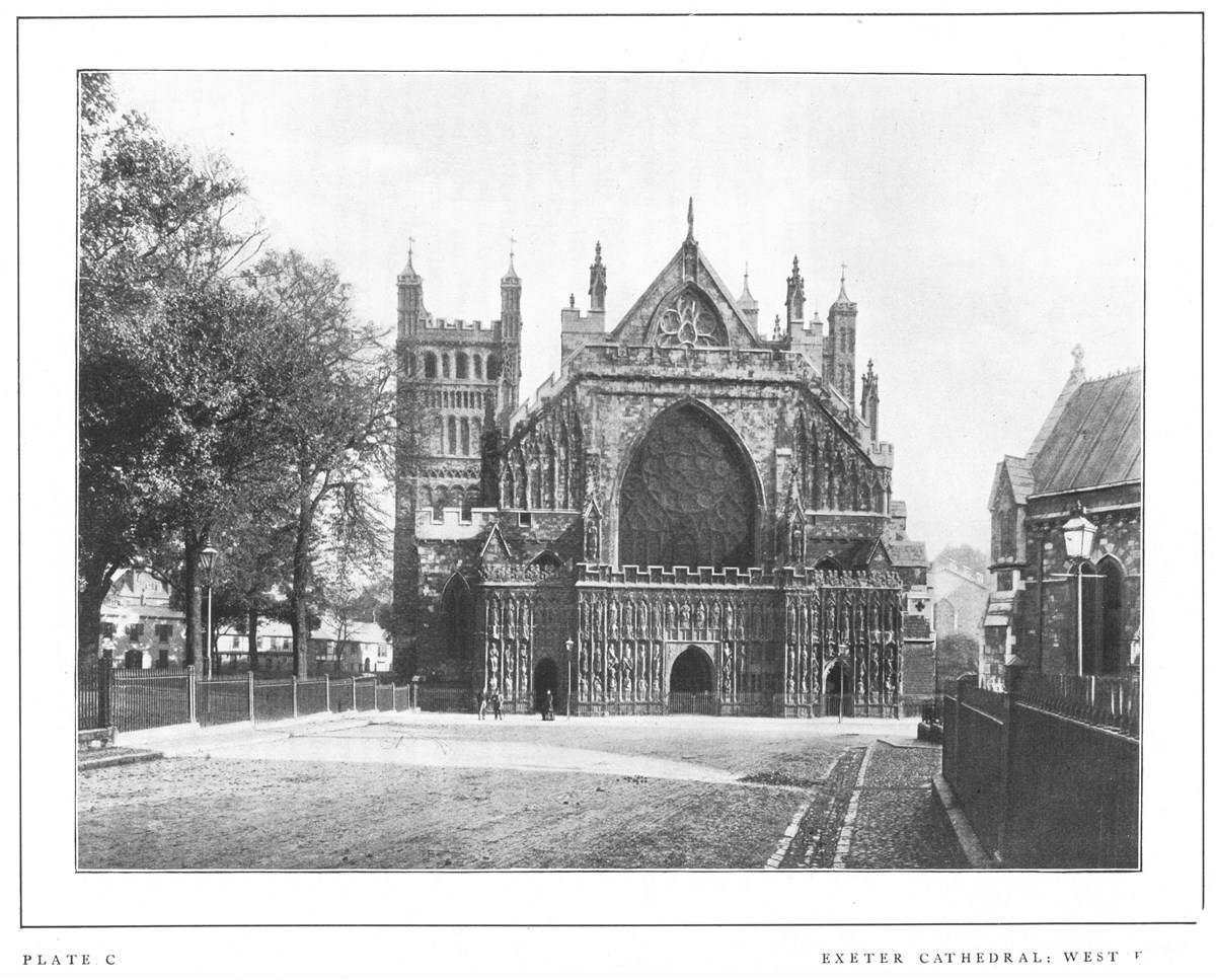 Exeter Cathedral, though comparatively small and unimposing, is, in virtue of its details, one of the most admirable examples in England of the Geometrical Decorated style. The oldest existing parts of the building are the transeptal towers, dating from the early part of the twelfth century, almost unique features in English churches. The rest of the cathedral was built, or, at any rate, altered from Norman to Decorated, between 1280 and 1370, mainly from designs of Bishop Quivil. The elaborate west façade was added by Bishop Brantyngham (1370-1394). The whole has been carefully restored.