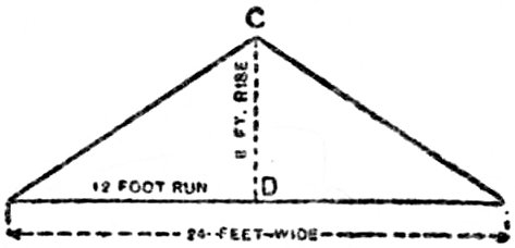 1. If your roof is raised 8 inches to the foot, or, as it is called, third pitch, under 8 on the first line are the figures 14.42. This is the length of common rafters for one foot run. If the building is 16 feet wide half the width of building would be the run of common rafter. In this case it would be 8; multiply 14.42 by 8, you have 115.36 inches, or 9 feet 7⅜ inches.