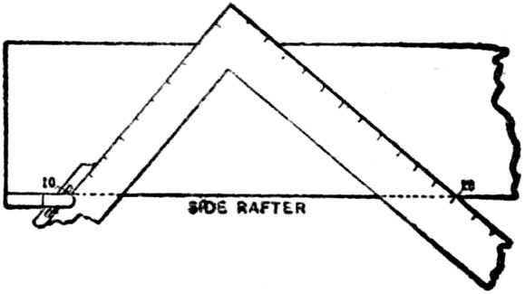 On the fifth line under 8 are the figures 10 and 12. By placing square on stock to be cut at these figures 10 on body, 12 on tongue, and marking on 12 side this gives side cut of jacks against hip or valley rafter.
