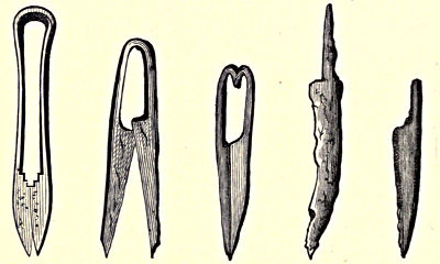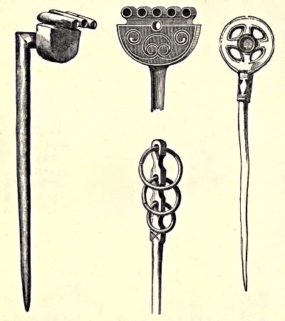 | Pins of iron, bronze, bone, and wood, &c. Iron shears and knives. Combs of bone and wood. Bronze tweezers. Stone and bronze ornaments: brooches, penannular rings, circlets, &c. Touchstones. Crucibles. Ornaments of gold and silver. Rings of stone, jet, and glass. Beads of stone, bone, jet, lead, earthenware, wood, and glass. | |