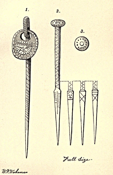 Plate VIII. and figures 18, 27, 57, 129, 188, 196, 197, and 216 were granted by the Council of the Royal Archæological Institute of Great Britain and Ireland; figures 206 and 207 by the Society of Antiquaries of London, together with plate III. taken from The Archæologia; figures 6, 7, and 8, by the Anthropological Society; figures 214 and 215 by the well-known antiquary, John Evans; plate XXXVIII., by W. T. Lockwood; and by permission of Robert Mac Adam figures 126, 147, and 148, are reproduced from the Ulster Journal of Archæology. As far as practicable, every hitherto published illustration bearing on the subject was applied for, and, with but one exception, most kindly granted.