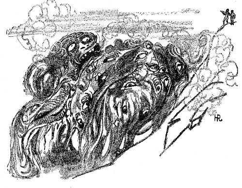 "Yes, Mis' Corey," came Sally's tremulous voice over the party wire, "Cha'ncey he just come back a-post-in', and couldn't haff talk fer bein' scairt! He says Ol' Whateley's haouse is all blowed up, with the timbers scattered raound like they'd ben dynamite inside; only the bottom floor ain't through, but is all covered with a kind o' tarlike stuff that smells awful an' drips daown offen the aidges onto the graoun' whar the side timbers is blowed away. An' they's awful kinder marks in the yard, tew—great raound marks bigger raound than a hogshead, an' all sticky with stuff like is on the blowed-up haouse. Cha'ncey he says they leads off into the medders, whar a great swath wider'n a barn is matted daown, an' all the stun walls tumbled every which way wherever it goes.