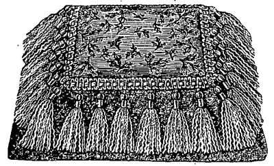A set of table napkins may be worked with a tiny design in each corner. Beautiful hair-receivers are made of tiny Japanese parasols, opened half way, and looped up with ribbon. A baby's rattle may be easily made. Set up twenty-four stitches with scarlet single zephyr, knit across plain twenty-two times, bind off, and leave an end long enough to sew up the sides. Run strong thread through every stitch on one end, draw up tightly, and fasten; then stuff it with cotton, and when nearly full put in a twisted cord. Then make two more pieces of other colors, stuff in the same way, and fasten little bells to each, attaching all three to a rubber ring.