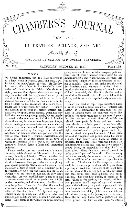 Under the head of paper toys, miniature packs of cards demand a large amount of material and labour. It is astonishing to read that one firm alone in London turns out each year one million packs of toy cards, using five or six tons of paper for the purpose, on each sheet of which are printed three packs in black and red. When these sheets have been pasted on cards—called 'middlings'—one girl can cut up and complete eight hundred and sixty-four packs each day, earning about one pound a week. These cards are sold at twopence, one penny, and a halfpenny a pack. The penny cards have, as might be expected, far the largest sale with the public; the manufacturer getting five shillings for a gross of twelve dozen, or somewhat less than half the retail price. Many thousand gross of these little packs go to all parts of the world. The twopenny packs are precisely the same as the penny packs, with the addition of an ornamental paper back to each card. The demand for these superior packs is small, for when the price of an article gets above a penny, we read that it at once shuts it out from a certain class of the buying public. The purchaser that will spend more than a penny will spend sixpence. The spending public, it seems, go in sets. There is the farthing set, mostly children, who patronise small shops of toys and sweets; there is the halfpenny set; and the penny set. We then jump to the sixpenny set. There is a very large manufacture of toy picture-books which are sold at one penny, a halfpenny, and a farthing. Even the farthing books have a picture on the cover printed in four colours; and valentines{658} printed from wood-blocks and hand-painted can be sold for a halfpenny.
