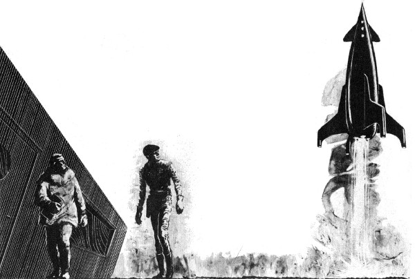 He turned and walked toward the buildings and Rossel had to follow. As Rossel drew near the walls the watchers could see his lips moving but could not hear him. Just then the ship lifted and they turned to watch that, and followed it upward, red spark-tailed, into the gray spongy clouds and the cold.
