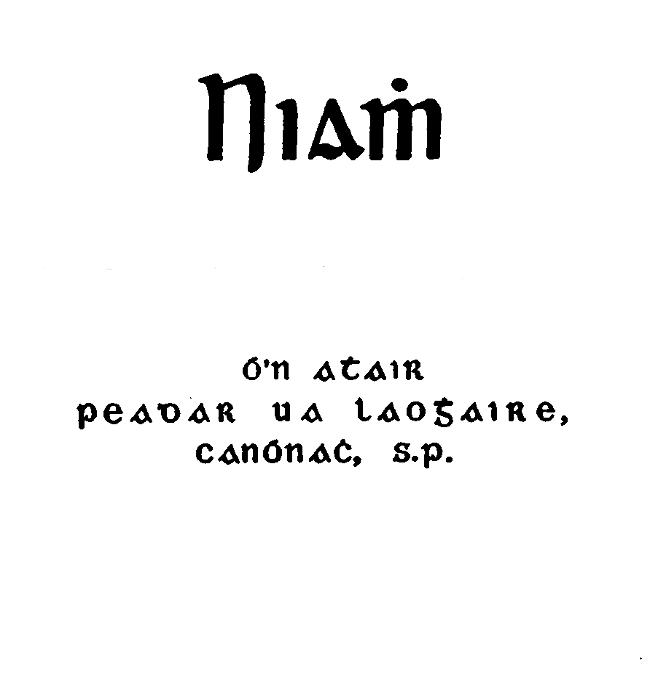 Do cuireadh isteach é ameasg na mac léighinn a bhí d’á n-ollamhughadh d’ Órd Bheannuighthe. Níor bh’ fhada gur h-airigheadh i gCeann Cora agus i n-Uíbh Máine gur deineadh. Dúbhairt a lán daoine gur mhaith é. Dúbhairt a lán eile gur mhór an truagh sagart a dhéanamh d’óigfhear chómh breágh chómh dathamhail. D’airigh Niamh é. D’airigh sí daoine ’ghá rádh gur bh’ áluinn an sagart a dhéanfadh sé. D’airigh sí daoine ’ghá rádh gur mhór an truagh sagart a dhéanamh dé. Bhí lán a croídhe d’iongnadh agus d’ alltacht istigh ’n-a h-aigne féin, ach ní baoghal gur leig sí amach aon phioc de’n iongnadh. Níor dhóich le h-aoinne beó uirthi go raibh sí ag cuimhneamh i n-aon chor air féin ná ar conus ba mhaith leis a bheatha do chaitheamh. Ach do bhí. Bhí dhá mhachtnamh ’n-a h-aigne ’n-a thaobh agus bhí sé ag teip uirthi glan an dá mhachtnamh a thabhairt d’á chéile,—an grádh úd a thaisbeáin sé a bheith aige dhí féin ó’n gcéad lá do chonaic sí é, agus an socarughadh so a bhí déanta anois aige ar bheith ’n-a shagart. Gan amhras dob’ fhíor nár labhair sé aon fhocal riamh léi ’ghá innsint di go raibh an grádh san aige dhi, ach níor dhein san blúire deifrígheachta sa sgéal.[30] Rud ab eadh é nár ghádh labhairt ’n-a thaobh. Bhí stoirm ’n-a h-aigne, ach do choimeád sí istigh é. Bhí sí chómh séimh, chómh solusmhar, chómh gealgháiriteach agus ba ghnáth léi bheith. B’ í an gath gréine céadna í ag teacht i gcuideachtain. Do tugadh fé ndeara, ámhthach, gur bhánuigh a h-aghaidh. Ach is ’mó trúig a dh’fhéadfadh bheith leis sin, agus níor chuir aoinne aon tsuim ann nuair nár thaisbeáin sí aon easba sláinte.