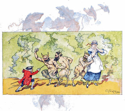 Le premier dimanche, en particulier, leur conduite servit à me mortifier. J’avais, la veille au soir, exprimé le désir que mes filles fussent habillées de bonne heure le lendemain, car j’ai toujours aimé être à l’église longtemps avant le reste de la congrégation. Elles obéirent ponctuellement à mes instructions; mais quand nous fûmes pour nous réunir au déjeuner du matin, voilà ma femme et mes filles qui descendent habillées avec toute leur ancienne splendeur, les cheveux plaqués de pommade, le visage marqueté de mouches à volonté, les jupes ramassées en paquet par derrière et bruissant à chaque mouvement. Je ne pus me retenir de sourire de leur vanité, surtout de celle de ma femme, de qui j’attendais plus de discrétion. Cependant, dans une circonstance si pressante, je ne trouvai d’autre ressource que d’ordonner à mon fils, d’un air important, de demander notre carrosse. Les filles furent stupéfaites du commandement; mais je le répétai avec plus de solennité qu’auparavant. «Sûrement, mon ami, vous plaisantez, s’écria ma femme. Nous pouvons parfaitement[30] aller à pied jusque-là; nous n’avons pas besoin de carrosse pour nous porter désormais.—Vous vous trompez, mon enfant, répliquai-je. Si, nous avons besoin de carrosse; car si nous allons à pied à l’église dans cet attirail, les enfants de la paroisse eux-mêmes feront des huées derrière nous.