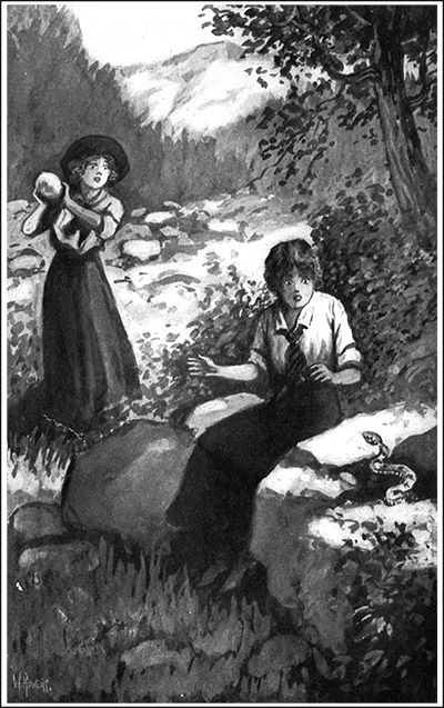 The girls had reached the bridge and had stopped upon it. The brown water was gurgling over the stones, the birds were twittering in the bushes, and the scent of the wild roses was wafted to them as they leaned upon the bridge-rail.