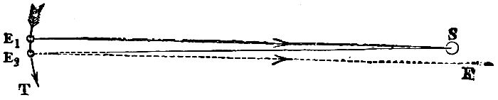 Every one knows that when we look at the heavens we do not see the celestial bodies where they are, but where they were, and again, not where they were at any one moment of time, but some where they were a short time ago, others where they were very long ago. But it is not so generally known, or remembered by those who do know it, that if light were not so active as it is the result would be that utterly incorrect pictures of the celestial depths would continually be presented to us. As matters actually are no orb in space can appear very far from its true place. We see the sun, for instance, at any moment, not where he is, but where he was (or rather towards the direction in which he lay) about eight minutes before. But as the real velocity of the earth, and therefore the apparent velocity of the sun, amounts only to about[12] eighteen miles per second, the sun is only thrown about 9000 miles out of his true position, which is but about the ninetieth part of his diameter: so that we see the sun very nearly in his right place. Now it might seem that a star whose light takes, say, twenty years in reaching us, must be seen very far from its true place, supposing the star to be travelling along very quickly; and, in one sense, this is true. If such a star is moving at the rate of fifty miles per second, athwart the line of sight, it will be out of place by so considerable a distance as 315,000,000,000 of miles. Yet the star will appear very nearly in its true position, simply because, at the star's enormous distance from us, even the great distance just named is reduced to a very small apparent amount. Such a star would, in fact, be displaced by only about the thirtieth part of the sun's or moon's apparent diameters, or by about a fifteenth part of the distance separating the middle star of the Great Bear's tail from its small companion, sometimes called Jack by the Middle Horse. Thus the stellar heavens present very truly to us the positions of the stars; for such athwart motion as I have just imagined would be very much larger than the motion of far the greater number of the stars. But we only thus see the heavens truly pictured because of the enormous velocity with which light travels. If light swept along only at the rate of a hundred miles in a [13]