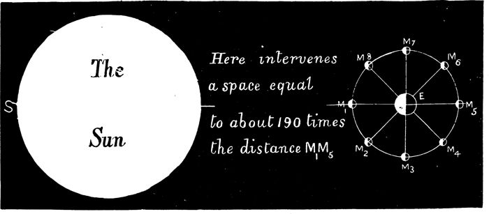 It is to distances such as these that the mind uncon[19]sciously refers the celestial bodies. We know that the moon is about 2,000 miles in diameter, but the mind refuses to present her to us as other than a round disc much smaller than those other objects in sight which occupy a much larger portion of the field of vision. The sun cannot be conceived to exceed the moon enormously in size, seeing that he appears no larger; and all the multitude of stars are judged by the sight to be mere bright points of light in reality as they appear to be.