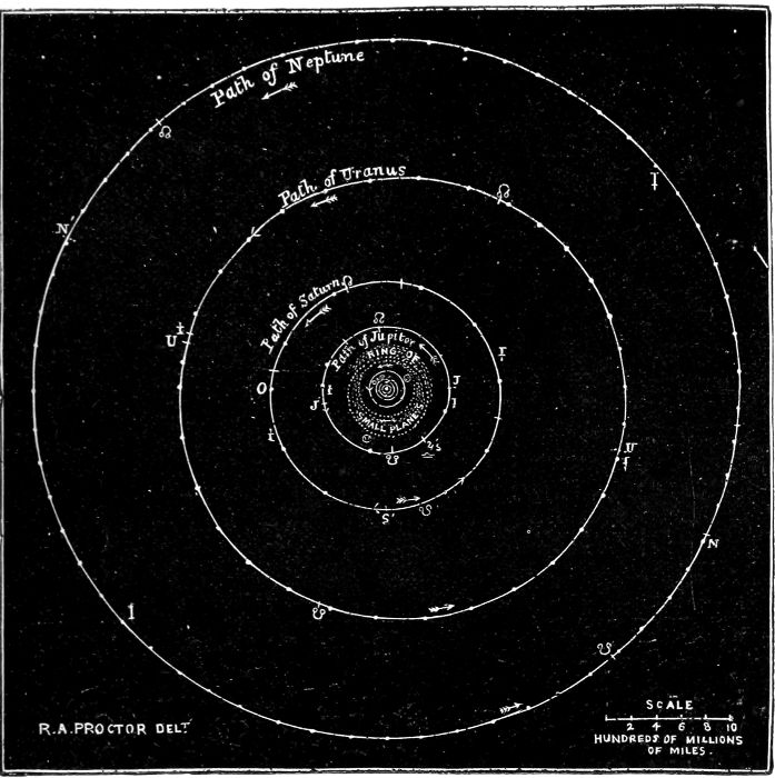 Yet, as a picture of a great mansion may be so drawn on a small scrap of paper as to convey just ideas of its proportions, so may the great truths which astronomy has taught us about the depths of space be so presented that just conceptions may be formed of the proportions of at least those parts of the universe which lie within[20] the range of scientific vision, though it would be hopeless to attempt to conceive their real dimensions.