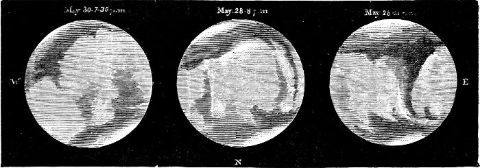 Although astronomy tells us in clearest words of the vast depths of space which surround our earth on all sides, we are not thereby enabled to realize their enormous extension. It is not merely that the unknown depths beyond the range of our most powerful telescopes are inconceivable, but that the parts of space which we can examine are on too large a scale for us to conceive their real dimensions. It is hardly going too far to say that our powers of actual conception are limited to the extent of space over which the eye seems to range in the daytime. Of course in the daytime, at least in clear weather, there is one direction in which the eyesight ranges over a distance of many millions of miles,—namely, where we see the sun. But the sense of sight is not cognisant of that enormous distance, and simply presents the sun to[18] us as a bright disc in the sky, or perhaps rather nearer to us than the sky. Even the distance of the sky itself is under-estimated. A portion of the light we receive from the sky on a clear day comes from parts of the atmosphere distant more than thirty or forty miles from us; but the eye does not recognise the fact. The blue sky seems a little farther off than the clouds, but not much; the light clouds of summer seem a little but not much farther off than the heavier clouds of a winter sky; a cloud-covered winter sky seems a little farther off than heavy rain-clouds. The actual varieties of distance among clouds of various kinds are not much more clearly discerned than the actual varieties of distance among the heavenly bodies. The estimate formed of the distance of a cloud-covered sky overhead probably amounts to little more than a mile, and it is very doubtful whether the mind presents the remotest depths of a blue sky overhead at more than two miles. Towards the horizon the distance seems greater, and probably on a cloudy day the sky near the horizon is unconsciously regarded as at a distance of about five miles, while blue sky near the horizon may be regarded as lying at a distance of six or seven miles, the arch of a blue sky seeming to be far more deeply curved than that of a cloud-covered sky.