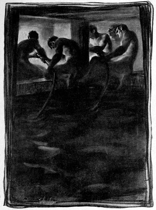 Through this narrow opening the firemen crawled into an atmosphere that was cool by comparison with the one they had been breathing in the burning cargo room; and they drew long breaths of relief there, looking around the well of steel at the bottom of which they stood. The German officer took a little tin lamp—the shape of a miniature watering pot with a flame in the spout—and held it to give light to the two stokers, who were screwing the bolts of the door in place again; and one of the stokers looked back over his shoulder, surprised at this condescension. The officer said nothing until both doors were fast. Then he growled at the stokers gutturally—and on the word[Pg 24] they dropped their tools and ran, with the whole party at their heels, between hot boilers, through dark furnace rooms, between more boilers, through the doors of other bulkheads, and finally into the grated galleries of the engine room, where they found two engineers still standing before their levers, waiting for further orders from the bridge.