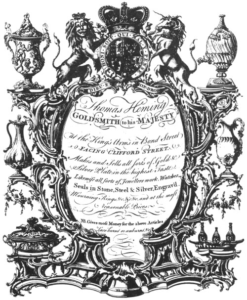 A typical London goldsmith’s trade card or shop bill. This one is reproduced from The London Goldsmiths, 1200-1800: A Record of the Names and Addresses of the Craftsmen, their Shop-Signs and Trade Cards, by Sir Ambrose Heal. As one may note, a great deal of work and imagination went into the preparation of Heming’s trade card. William Hogarth, the eminent English artist who served six years as apprentice to a London silversmith, is known to have engraved two or three goldsmith’s trade cards of simpler design.