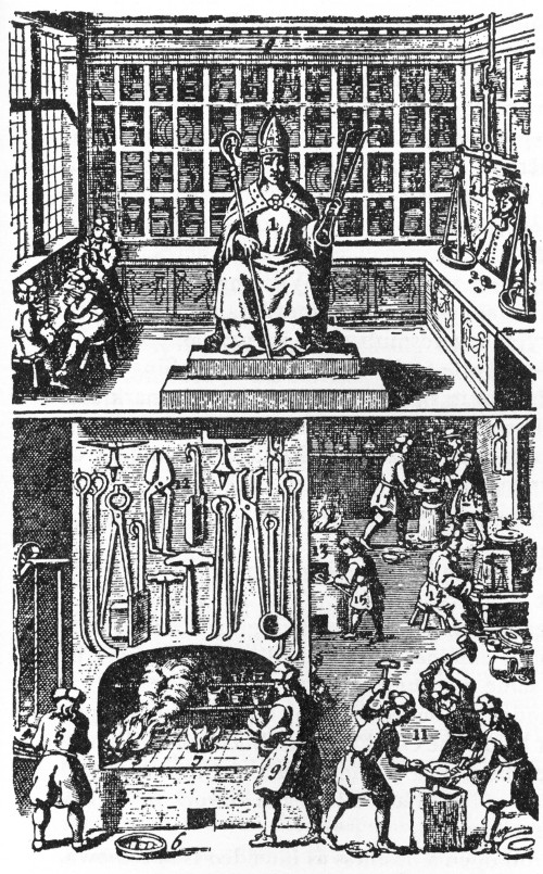 Frontispiece of A New Touchstone for Gold and Silver Wares by W. B., published in London in 1679. By William Badcock, a London goldsmith, it was the standard seventeenth-century reference book on metalwork. The forge, bellows, and tools are typical of those of the craft, of which St. Dunstan was the patron saint.