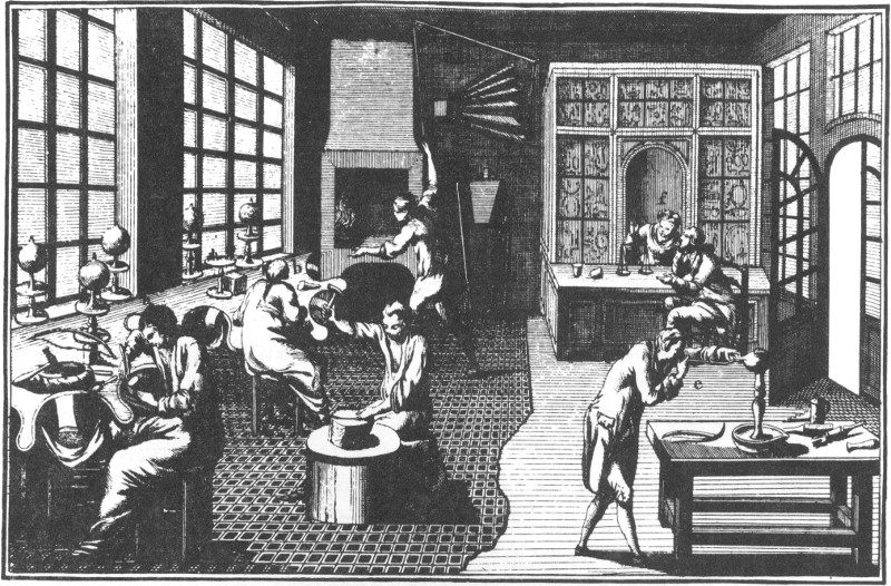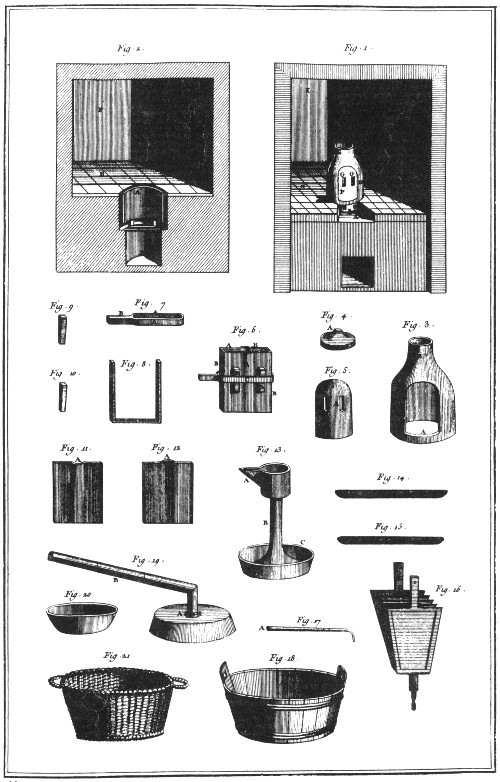 This is a shop where smaller pieces were made. We would refer to it as a jewelry shop. The workmen are shown melting the metal, hammering on an anvil, soldering with a mouth blow pipe, and setting the stones. DIDEROT.