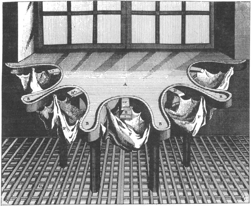 A work bench which could accommodate five workmen, allowing each to take advantage of daylight. The latticed floor caught filings and bits of metal which were salvaged and subsequently refined. DIDEROT.