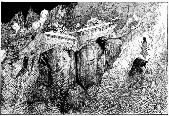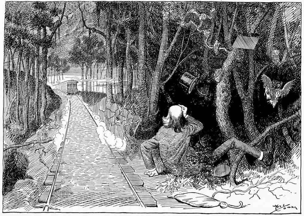 An irresistible impulse prompts him to walk to the rear platform of the car. A sudden lurch of the train as it turns round a curve in the track and he finds himself lying prone by the road side.