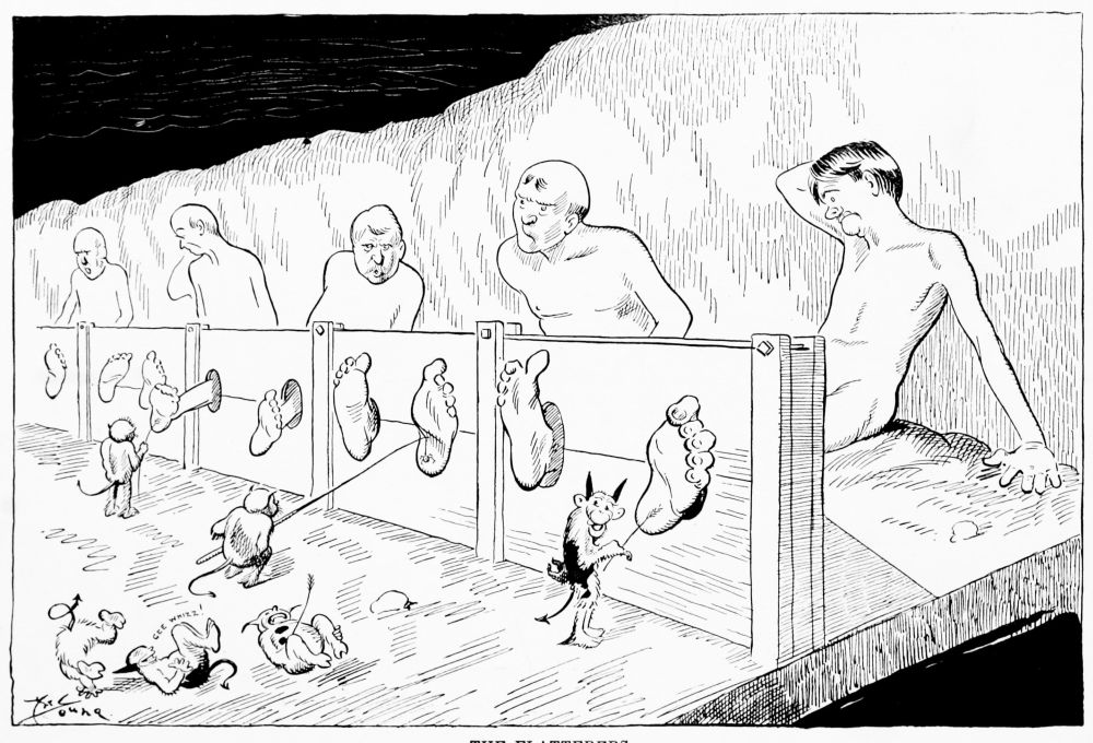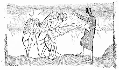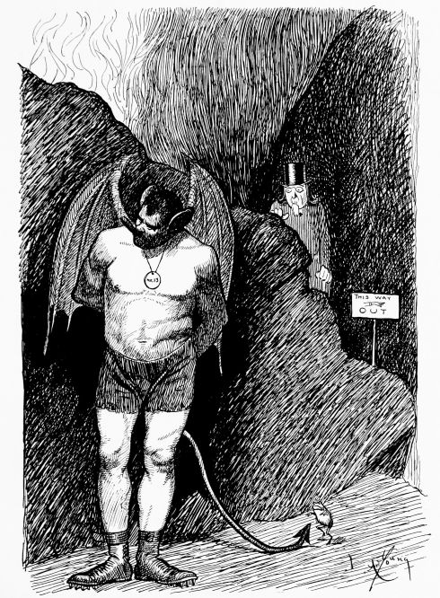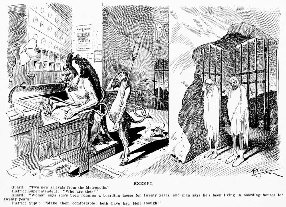 Hiprah Hunt is at the American entrance to Hell. He stands amidst a throng of Demons, sinners and employees of the realm. Crowds of men are getting overcoats checked and buying fans. He buys one himself, and also secures a guide book, locating the different sections and departments. He sees over the portal’s lofty arch the words “Leave all hope on the outside.” This demand he will not entirely accede to. He retains a little, thinking he may need it later on.