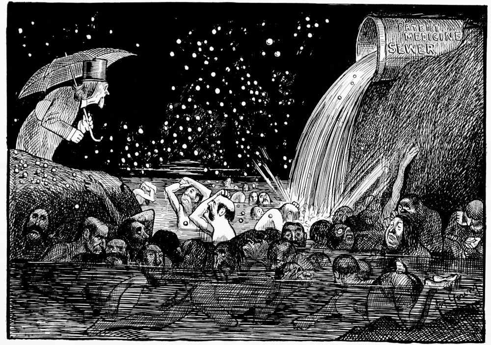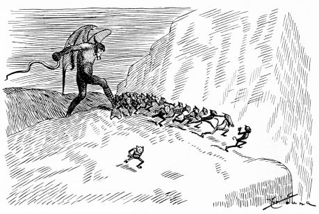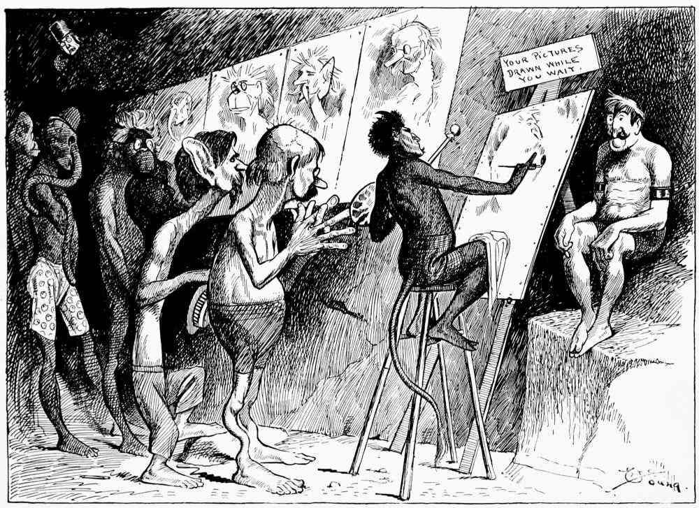 Coming into the second district Mr. Hunt is debating which way he shall proceed, when he hears a scuffling on the heated asphalt road behind him. He turns and sees passing a drove of human-footed sheep, led by a monkey, whose contortions they are compelled to imitate. Mr. Hunt consults his guide book and learns that these are the people who did things because others did them, never taking the trouble to think for themselves.