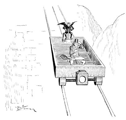 Finally, he comes to a projecting precipice from which he peers and discerns a dim light through the sluggishly rising smoke. As he crawls lower he hears voices, and a great commotion. An odor of burning brimstone fills the air. He swings out from an over-hanging rock and allows himself to drop.
