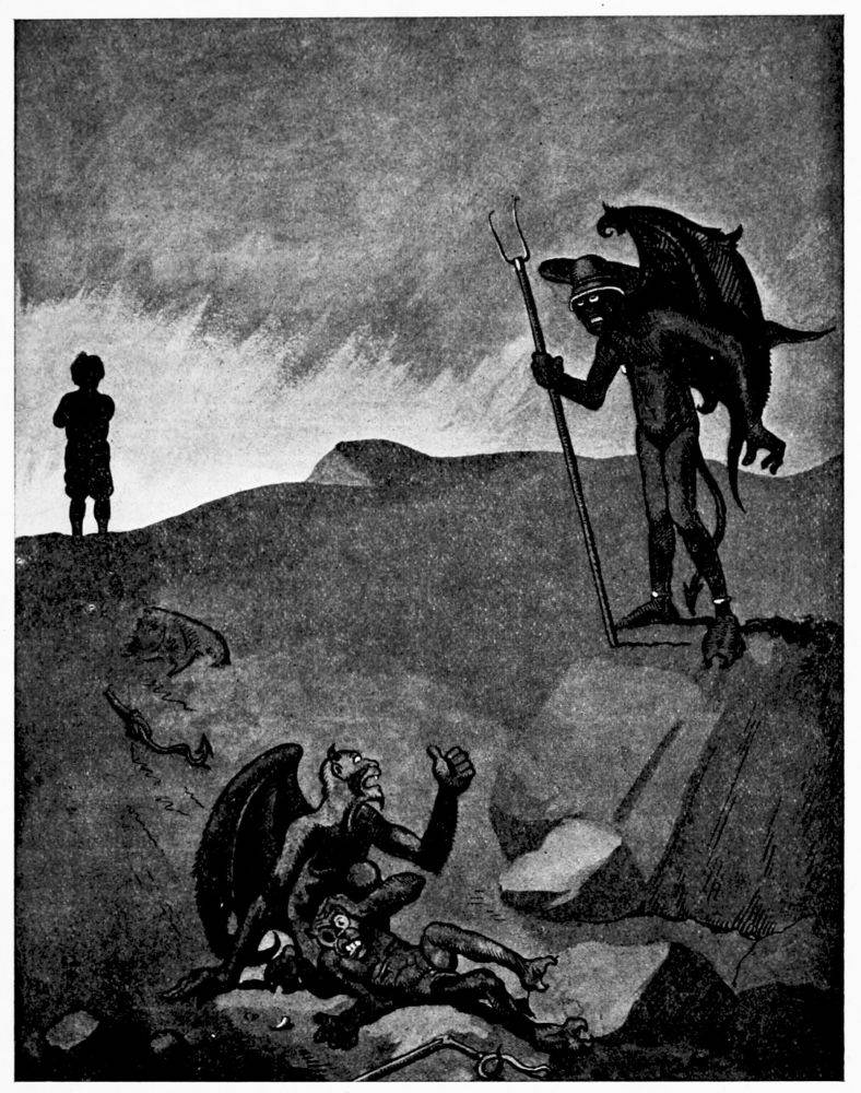 Mr. Hunt courteously declines the aid of guides whose services are offered by Satan preferring, as he explains, to go unattended, and makes his way to what is known as the first district of Hell.