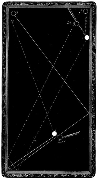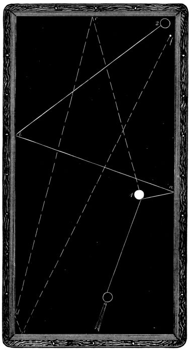 Obscure as that of the game itself is the origin of the “twist” and the “draw,” the two most important strokes in modern billiards. England claims them both for John Carr, the “Bath Marker,” on the ground that, at some time prior to 1823, he was the first to chalk a cue, which is not a fact; and France claims them for one Capt. Mingaud, an alleged professional billiardist, who, while imprisoned for a political offence in 1823, invented the cue-leather. As the writer recalls this Mingaudism in its entirety, as published in a book issued in Paris about 1868 and reprinted in the Billiard Cue here, it was manifestly pure romance. France may never have had a professional so named, but France did have a Capt. Roget de Lisle, who, imprisoned for a political offence about the beginning of the last century, invented the deathless “Marseillaise.” Moreover, it was about 1868 that the 7writer, on the authority of Prof. Wm. Lake, who was a professional billiard-player here before and after 1823, published that Camille Avout, a shoemaker, was the pioneer in turning out cue-leathers in New York City prior to 1823, in which year a few were imported from France.