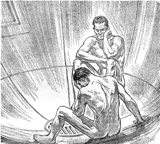 There were no blankets or bunks in the cell and there was no light save when the guard came, and then there was a blinding torrent of it. The walls sloped toward the center and there was no flat floor but a rounded continuation of the walls. The entire place was built of especially heat-conductive metal and the two prisoners had been stripped of all their clothes.