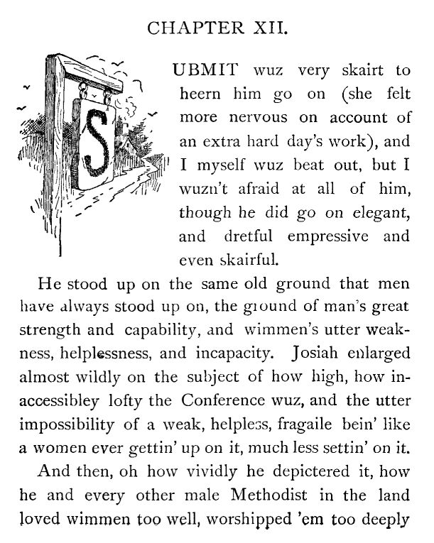 Sez I, “She wuz in the wrong on't in not lettin' wimmen set on the Conference.”