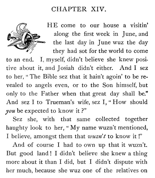 And Josiah sez, “Dumb 'em! I guess a man is a goin' to make money when he has got a chance.” And I asked him plain if he had got so low, and if I had lived with him twenty years for this, to hear him in the end dumb religious duties.