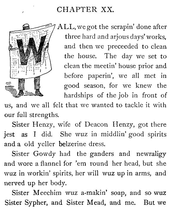 For I well knew jest as he did that wimmen wuz most always the ones to go ahead in church and charitable enterprises. And especially now, for there wuz a hardness arozen amongst the male men of the meetin' house, and they wouldn't do a thing they could help (but of this more anon and bimeby).